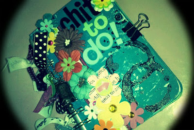 Tonight I created this ever so fun recycled, upcycled and altered journal! It is totally from my scrap bin. The chipboard was from hubby’s work, paper is all from the scrap bin! I was so happy to get this together and it was all in less than 2 hours (including drying time!)