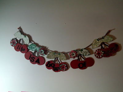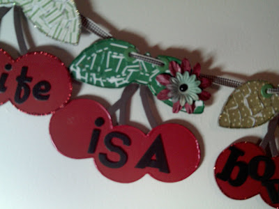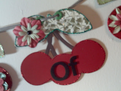 The album is the cherry chipboard album that can be found at Michael’s in the $1 Spot. I painted the cherries and stems. I used torn scrap green paper for the “leaves”. I then used white primas that had been sprayed with Red Velvet Glimmer Mist, Candy Apple Red Glimmer Mist, Meadow Green Glimmer Mist, Honeydew Mist Glimmer Mist and English Ivy Glimmer Mist. I put a black Prima pearl in the center of each flower. I used WeR Memory Keepers XL Eyelets as the hanging part and strung it with May Arts ribbon. I outlined the edges of the cherries and the leaves with Stickles and Liquid Pearls.
