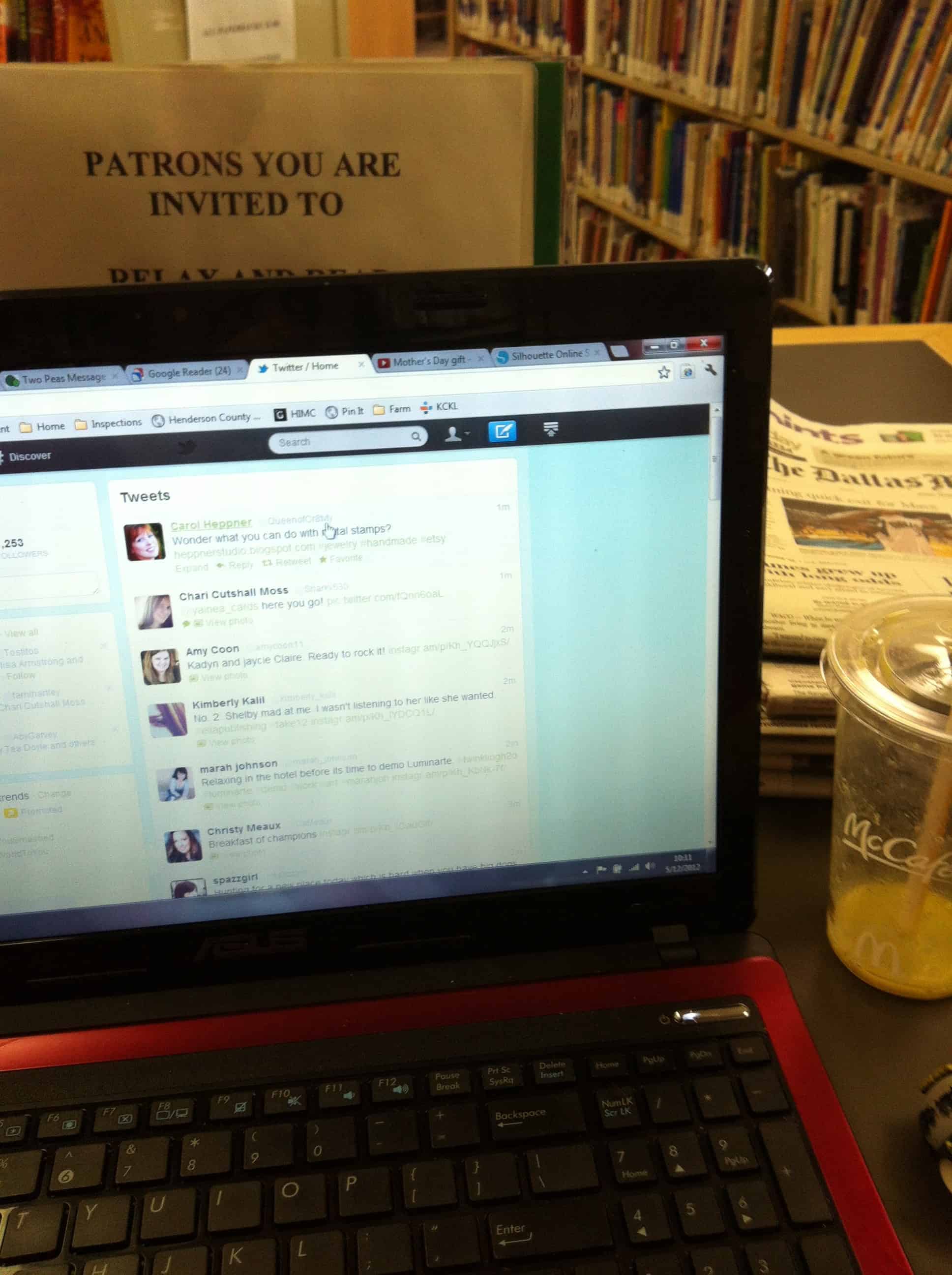 Spent some time at the library catching up on Twitter, blogs and what not. Checked out the Laurell section to see if they had the third Anita Blake book in stock so I didn’t have to buy it. Nope. Guess Half Price Books is now on my list. Went to hubby’s work to pick him up. I always go against the grain there.